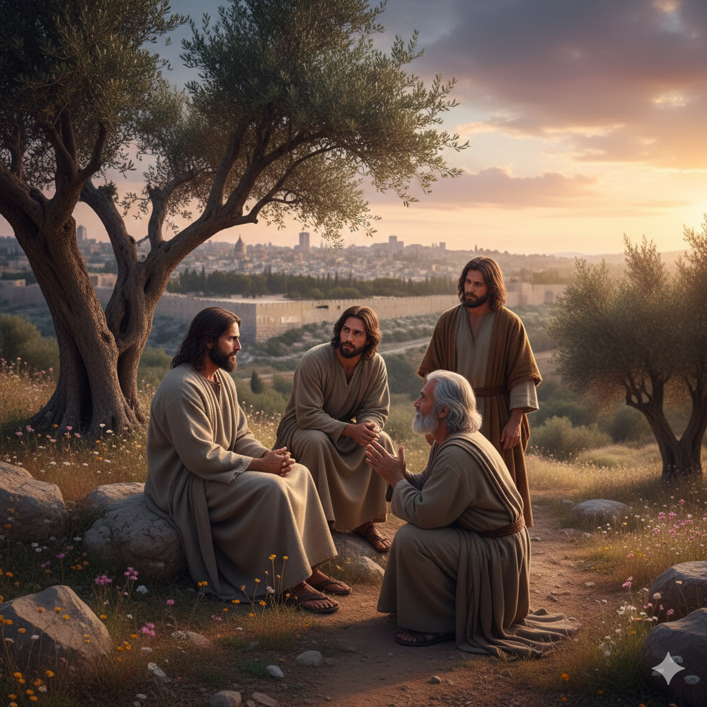 Mt 24:3: "No monte das Oliveiras, achava-se Jesus assentado, quando se aproximaram dele os discípulos, em particular, e lhe pediram: Dize-nos quando sucederão estas coisas e que sinal haverá da tua vinda e da consumação do século."