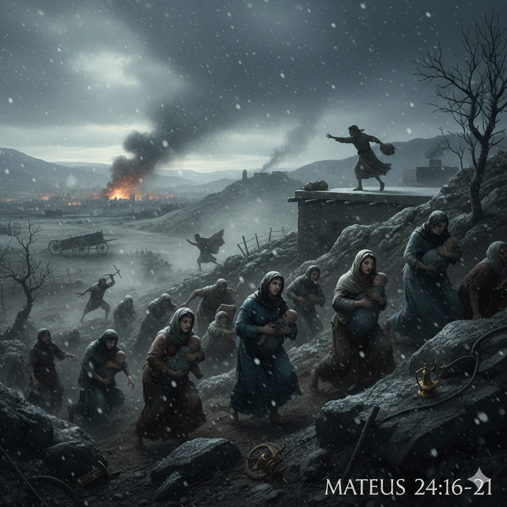 Mt 24:16-21: "então, os que estiverem na Judéia fujam para os montes; quem estiver sobre o eirado não desça a tirar de casa alguma coisa; e quem estiver no campo não volte atrás para buscar a sua capa. Ai das que estiverem grávidas e das que amamentarem naqueles dias! Orai para que a vossa fuga não se dê no inverno,...